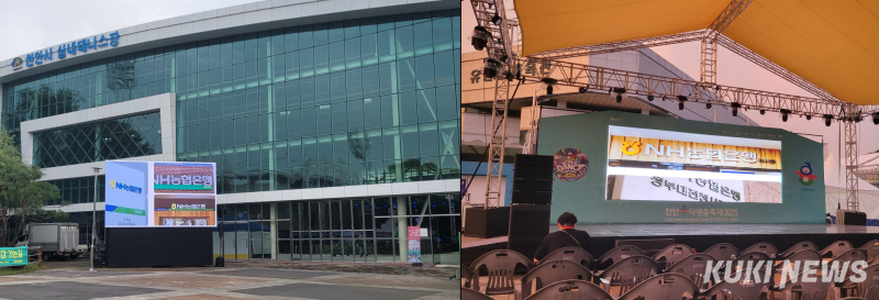 농협 천안시지부는 지난 9일 성공기원 후원금 2000만원을 천안시에 기부했다. 이에 대한 천안시 보답일까. 25일 오후 6시 국제춤대회가 취소된 야외무대 전광판은 이후 내내 농협 홍보 동영상을 송출했다. 농협 동영상은 2분 10초 동안 농협의 각종 사업과 브랜드 위상을 홍보하며 고객상품을 소개했다. 비교적 긴 시간으로 농협 활동상을 알리기에 충분했다. 뒤따라 ‘구색갖추기용’ 흥타령춤축제 홍보동영상이 이어졌다.