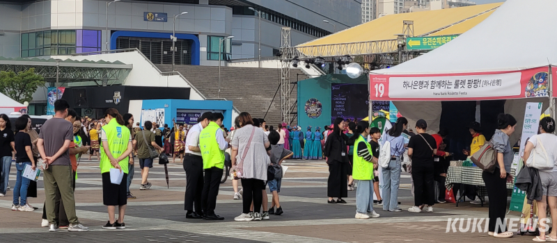 실제로 25일 유관순체육관 앞 야외무대와 실내테니스장 입구의 전광판은 쉼 없이 농협 홍보동영상을 내보내고 있었다. 또 행사장에 부스를 마련한 한 은행과 지평막걸리는 자사 어플 설치를 권하며 관람객 발길을 잡고 있다.