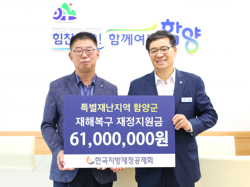 함양군(군수 진병영)은 22일 행정안전부 산하 지방재정 전문기관인 한국지방재정공제회(이사장 정선용)로부터 특별재난지역 재해복구 재정지원금 6,100만 원을 전달받았다.
