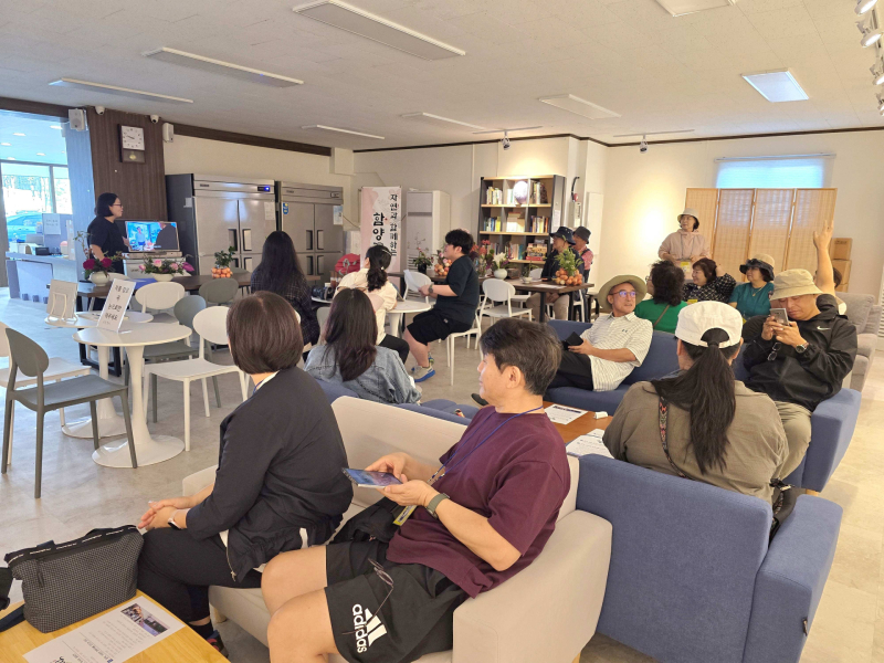 ‘함떡카페(귀함갤러리)’ 내부는 함양꽃피우리동아리 회원들의 재능기부로 꾸며졌다. 함양 양파, 곶감, 들꽃을 활용해 전시 테이블을 장식한 공간은 방문객들에게 눈과 입이 즐거운 특별한 경험을 선사했다.