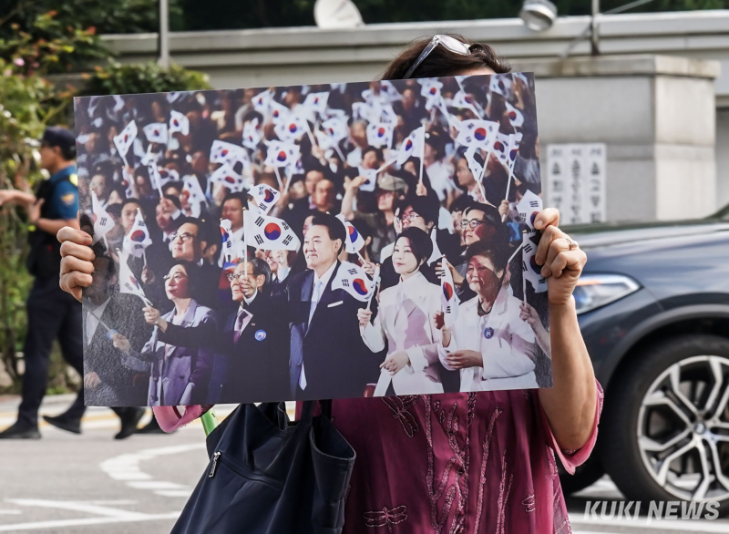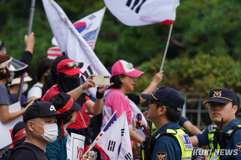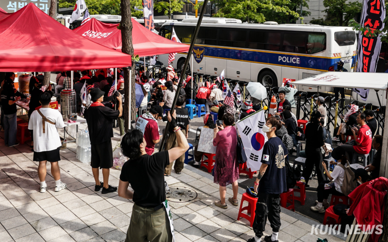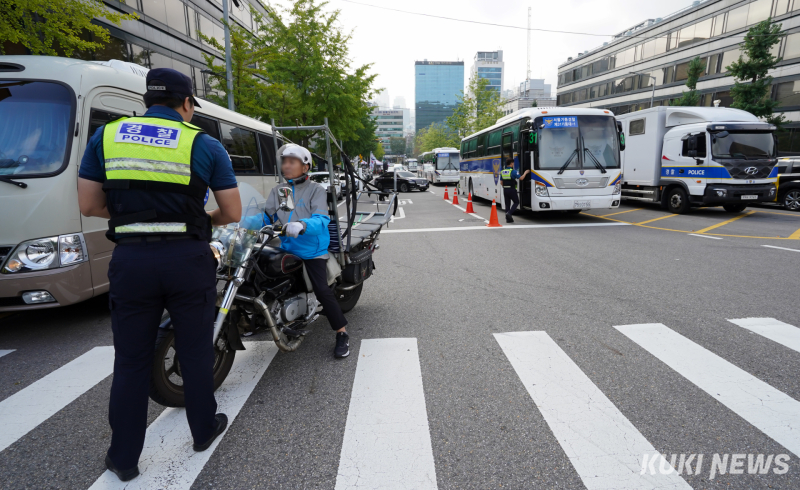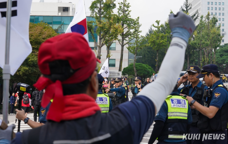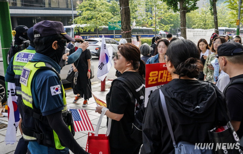 이날 오전 9시 40분쯤 경찰은 법원 서문 앞에서 대기하던 일부 참가자들에게 “법원 인근 100m는 집회 금지 구역으로, 개별적으로 모였더라도 동일한 구호를 외치면 집회로 간주된다”며 이동을 요구했다. 그러자 참가자들은 “주관적인 판단으로 말하지 말라”며 반발했지만, 곧 집회 장소로 자리를 옮겼다.