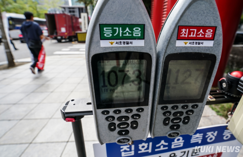 또 윤 전 대통령의 출석이 임박한 10시쯤에는 한 집회 현장에서 소음이 최고 기준치를 초과하기도 했다. 참가자들이 음악 소리와 함께 “윤석열 대통령”을 연호하자 현장 최고소음은 112.7dB까지 치솟았다. 서초경찰서에 따르면, 이날 주간 허용 최고소음 기준은 80dB이다. 경찰은 소음 수치를 확인한 뒤 “곧 조치에 들어갈 것”이라고 밝혔다.