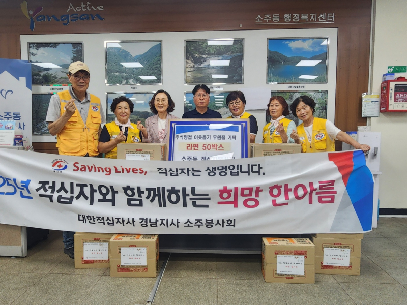 양산시 소주동 적십자봉사회(회장 박용의)는 지난 25일 소주동행정복지센터(동장 이순재)에 라면 50박스를 기탁했다.