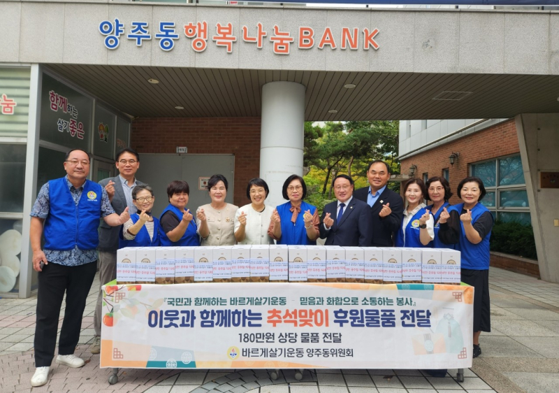 바르게살기운동 양주동위원회(위원장 전금옥)는 지난 24일 추석을 맞아 참기름·들기름 선물세트를 어려운 이웃 60세대에 전달했다. 선물세트는 180만 원 상당으로 홀몸 어르신 등에 전달됐다.