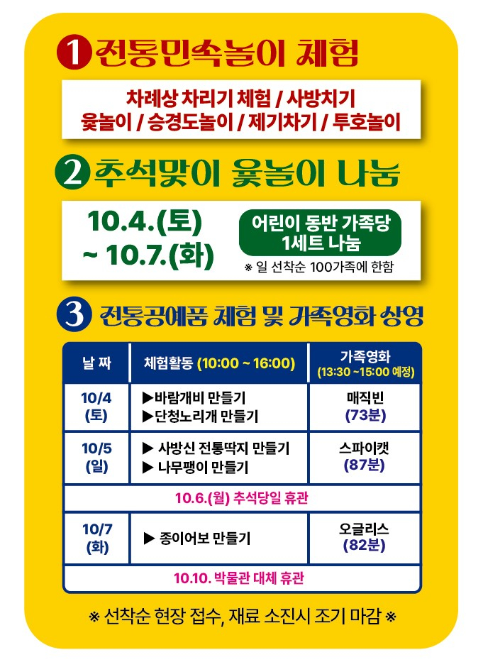 전통공예품 만들기 체험은 별도의 예약 없이 재료 소진시까지 선착순으로 진행한다. 연휴 기간 중 추석 당일인 10월 6일은 휴관이다.