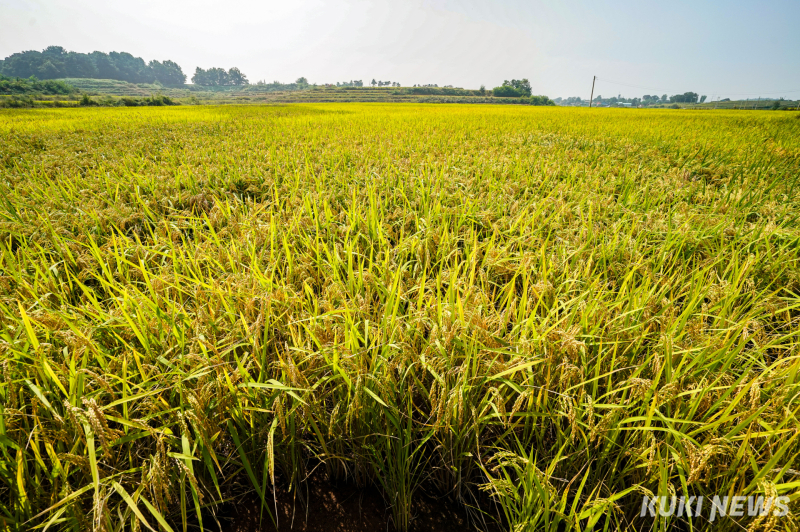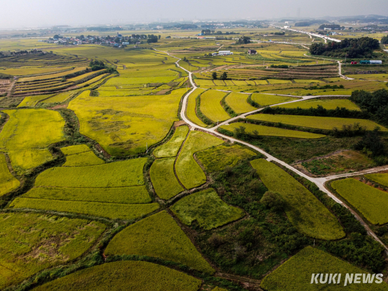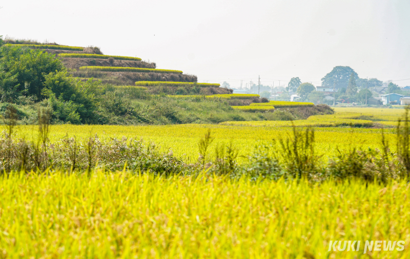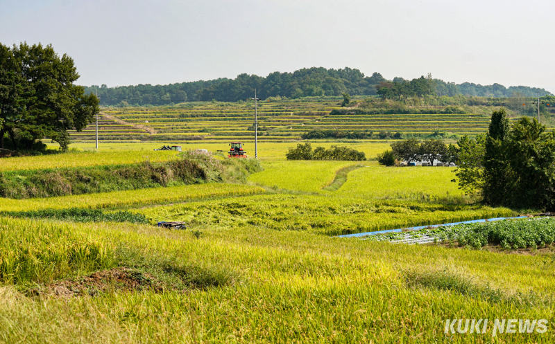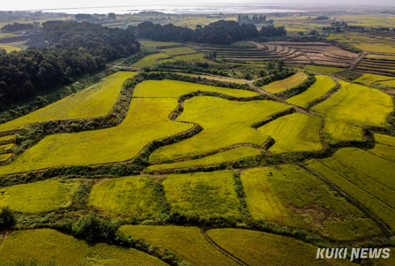 추석을 열흘여 앞둔 26일 경기 평택시 현덕면 장수리 다랑이 논은 황금빛으로 물들었다. 굽이진 논의 층계를 따라 가을 바람도 일렁였다.