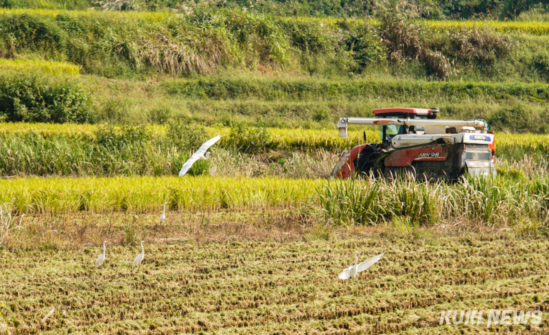 다랑이 논은 곡선의 층계와 직선의 시멘트 도로로 구역이 나뉘어진다. 도로와 인접한 논 한쪽에서는 농민들이 수확을 서두르고 있었다. 콤바인이 지나간 자리마다 흙빛으로 수확의 흔적이 남았다. 이삭이 떨어진 논바닥을 차지한 것은 백로였다. 하얀 날개를 펼치며 내려앉은 백로들은 논바닥을 뒤적이며 작은 곡식 알갱이를 꺼냈다.