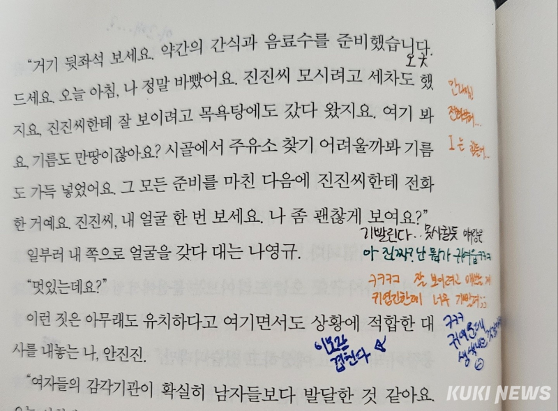 교환독서의 진짜 재미는 솔직한 표현에서 나온다. 출판사에 근무하는 김수경씨는 책 속 주인공의 행동이 마음에 들지 않으면 “미쳤다”, “진짜 이해 안 된다” 같은 말을 거침없이 적었다. 혼자였다면 속으로만 삼켰을 감정을 글로 남긴 것이다. 다시 책을 돌려받았을 때 친구가 똑같은 반응을 남겨둔 것을 보고는 크게 웃었던 기억도 있다. 그는 이런 순간이 “마치 대화를 주고받는 듯했다”며 교환독서가 주는 편안함과 해방감을 강조했다.