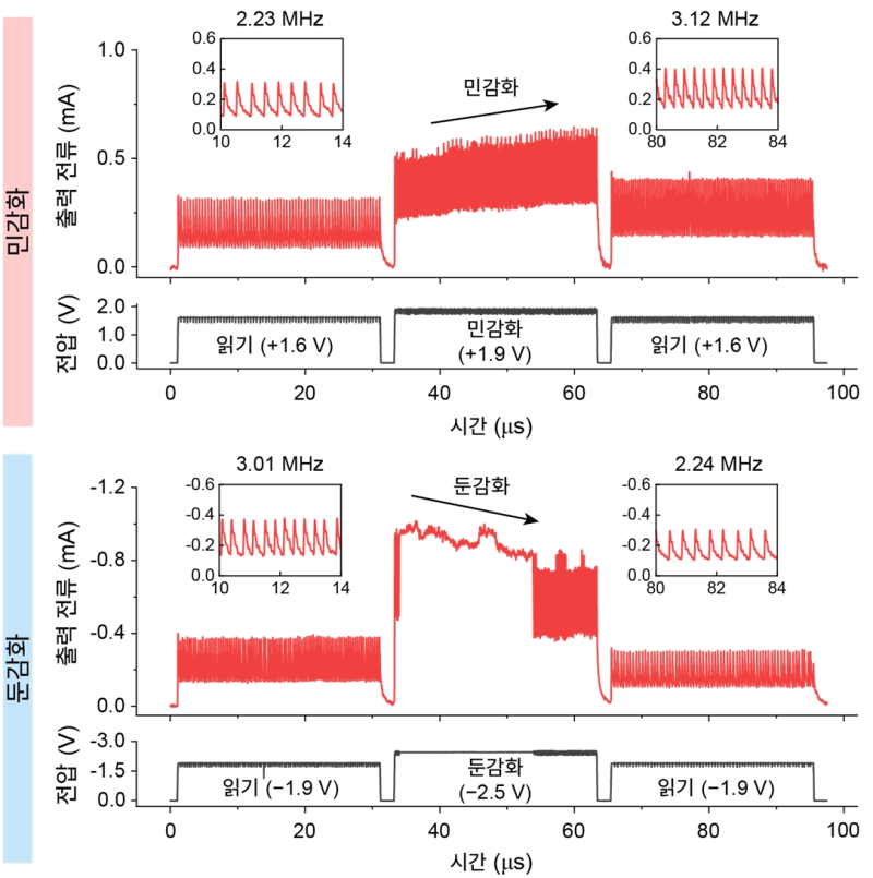 이를 통해 뉴런이 자극에 따라 반응이 민감해지거나 둔감해지는 현상을 구현했으며, 다단계의 정교한 주파수-전압 특성을 확보했다.