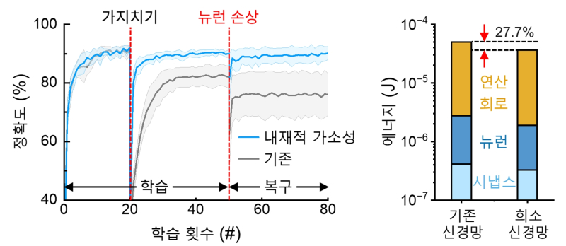 특히 신경망 뉴런의 30%를 의도적으로 손상시킨 후 추가 학습을 진행하자 내재적 가소성이 적용된 신경망은 손상 이전 수준인 90.2%까지 정확도를 회복, 네트워크가 스스로 재구성돼 성능을 회복하는 뛰어난 복원력도 입증했다.