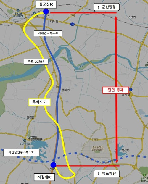 교통 통제로 정체가 발생할 경우에는 목포에서 군산 방향으로 이동하는 차량은 서김제IC로, 군산에서 목포 방향으로 이동하는 차량은 동군산IC로 진출해 국도 29호선을 거쳐 고속도로를 재진입하면 된다.