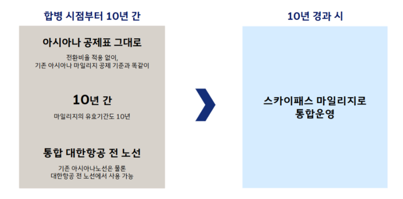 대한항공이 아시아나항공과의 통합을 앞두고 마일리지 운영 방안을 공개했다. 아시아나 마일리지를 향후 10년간 별도로 유지하고, 원할 경우 대한항공 스카이패스 마일리지로 전환할 수 있도록 한 것이 핵심이다.