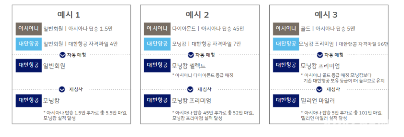 기존 아시아나항공 우수회원은 대한항공의 유사 등급으로 자동 매칭된다. 아시아나의 플래티늄, 다이아몬드 플러스, 다이아몬드, 골드 등은 대한항공의 모닝캄 계열로 연결되며, 자격 기간도 그대로 보장된다.