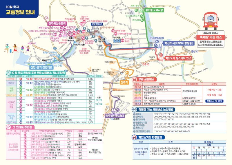 시는 추석 연휴를 포함한 10월 축제기간에 수백만 명의 관람객이 축제장을 방문할 것으로 예상됨에 따라, 교통 종합상황실 운영, 안전 관리요원 배치, 교통체증 완화 대책 추진, 축제장 주변 차없는 거리 조성, 축제장 방문객 교통편의 정보 제공 등 맞춤형 교통서비스로 관람객의 교통불편을 해소하고 교통안전을 확보한다는 방침이다.