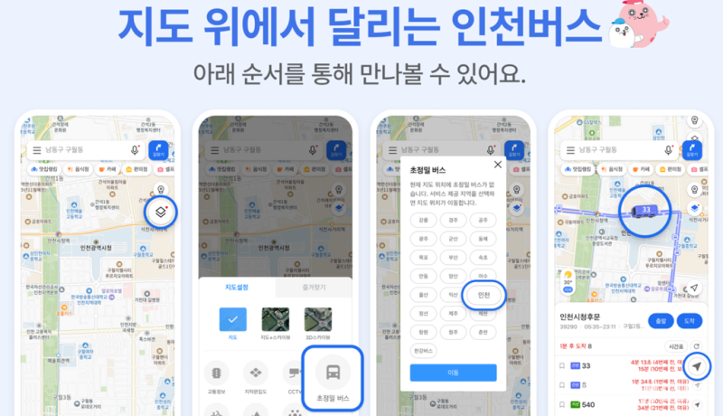 인천시는 카카오맵을 통해 시내버스의 실시간 위치를 알려주는 버스 위치 서비스를 제공한다고 30일 밝혔다.