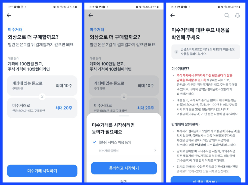 실제 토스증권 앱을 확인한 결과, 주식 구매 창에서 ‘미수거래’ 버튼을 누르면 외상으로 주식을 매수할 수 있다는 내용의 팝업 창이 나타난다. 이 단계에서는 위험성에 대한 안내를 받을 수 없다. 네티즌들이 문제 삼은 지점은 이 화면인 것으로 파악됐다. 다만 팝업 하단의 ‘미수거래 동의하고 시작하기’ 버튼을 누르면 이용자 동의 절차와 함께 주요 안내 사항이 제공된다.