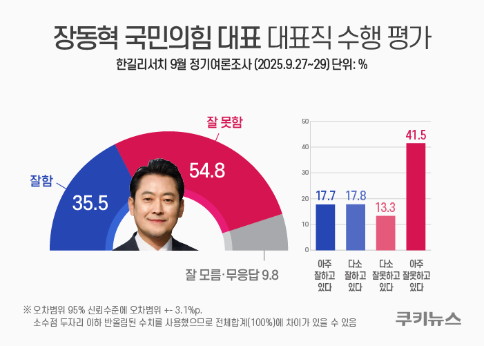 장동혁 당대표의 직무수행에 관해선 잘 못함이 54.8%(아주 잘못 41.5%, 다소 잘못 13.3%)로 잘함 35.1%(아주 잘함 17.7%, 다소 잘함 17.8%)에 비해 19.7%p 높았다.