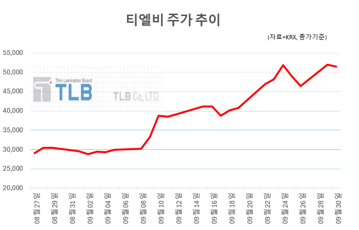 1일 한국거래소(KRX)에 따르면 티엘비는 9월 한달(9월1일~30일) 동안 74.3% 상승률을 기록했다. 월 초 3만원대였던 주가가 5만원을 뛰어 넘었다.