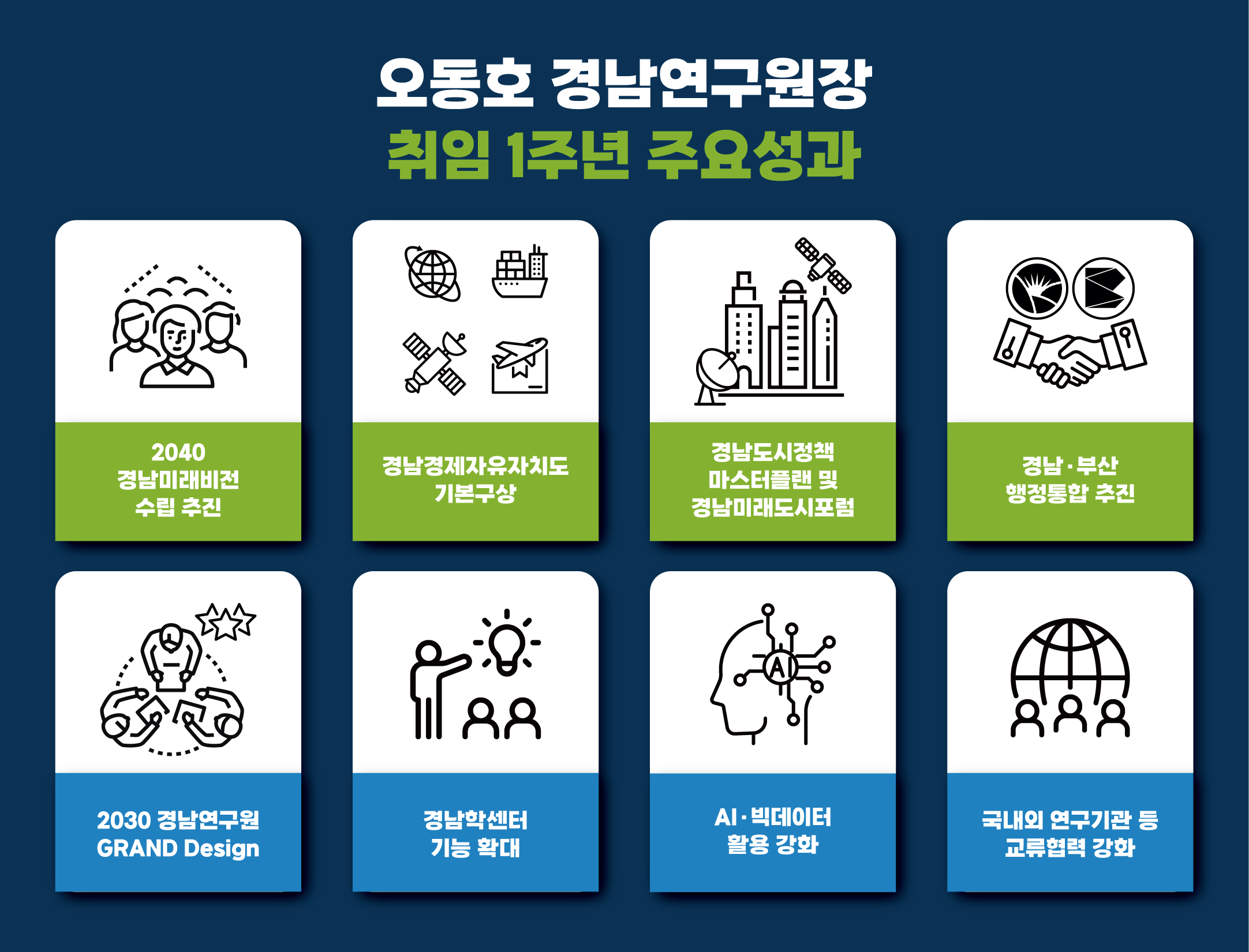 오 원장은 취임 뒤 가장 먼저 경남연구원의 혁신을 위한 '2030 경남연구원 GRAND Design'을 마련했다. ‘글로벌 미래전략원, 경남연구원’을 새로운 비전으로 내세우고, 이를 실현하기 위한 △미래전략 전문연구기관 △경남도정 Think Tank △경남학 산실 △지식공동체 플랫폼 허브 △베스트 지역연구원이라는 5가지 추진전략을 제시했다.