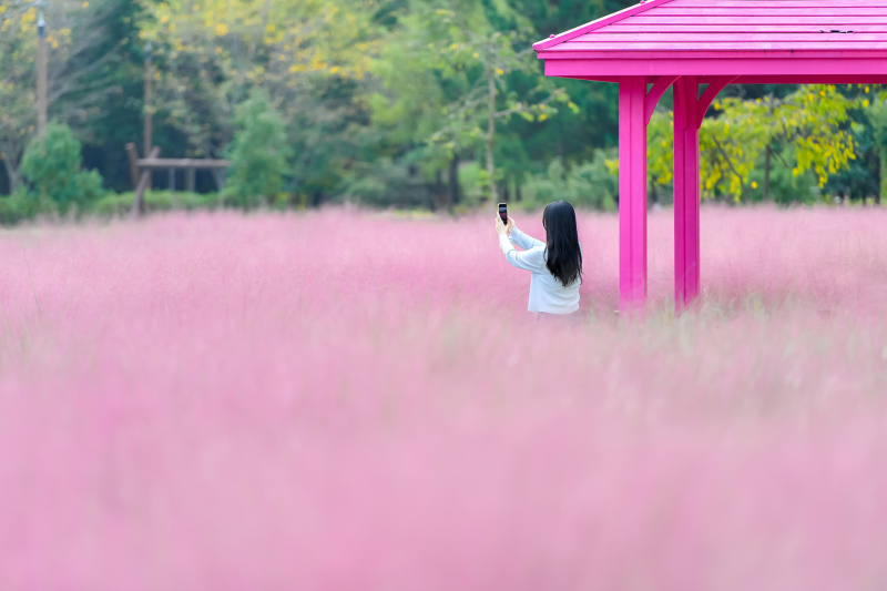드넓게 펼쳐진 함안 악양생태공원에는 신비로운 분홍빛 핑크뮬리 군락이 만개해 몽환적인 분위기를 자아낸다. 삼대가 함께 인생사진을 남기려는 방문객들의 발길이 이어지고 있다.