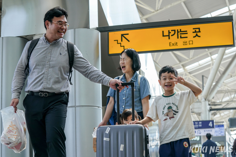 추석 연휴를 앞둔 2일 서울역에서 한 가족이 기차를 타기 위해 이동하고 있다.