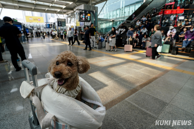 추석 연휴를 앞둔 2일 서울역에서 강아지가 캐리어 위에 앉아 있다.