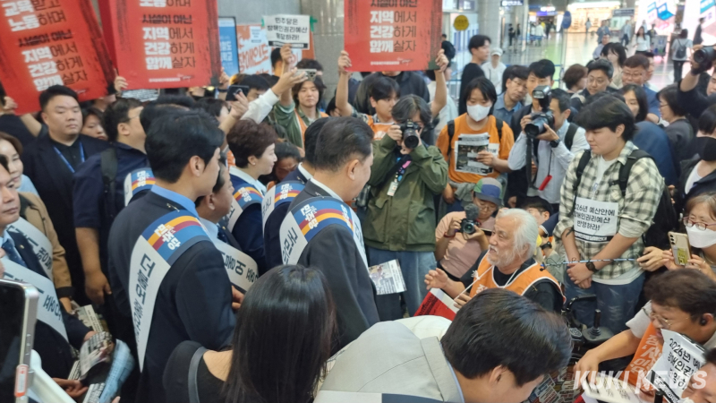 이날 전국장애인차별철폐연대(전장연)는 “교통약자의 이동권을 보장하라”, “장애인 권리 예산을 반영하라”는 구호를 외치며 시위를 벌였다. 민주당 지도부는 전장연 활동가들을 만나 요구 서한을 전달받고 짧은 대화를 나눴다.