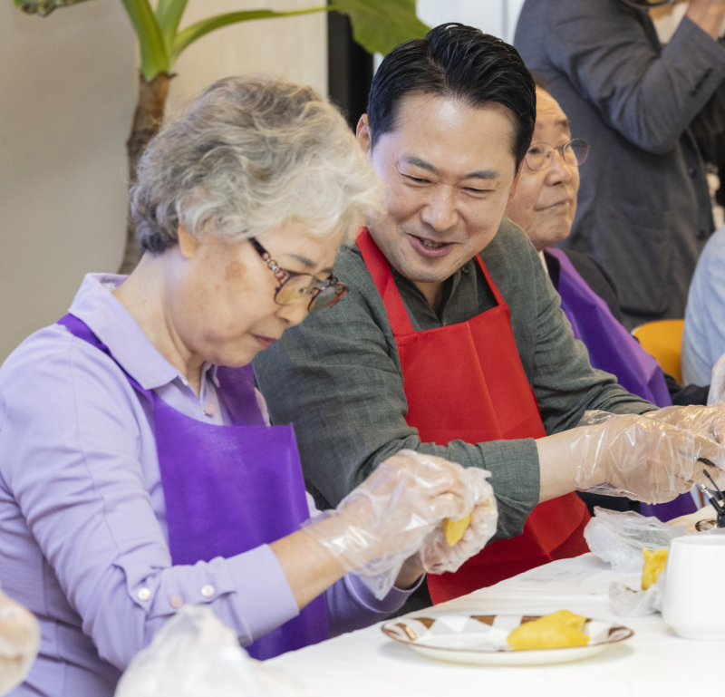 장동혁 국민의힘 대표가 2일 서울 동대문구 동백꽃노인복지관에서 추석맞이 송편 빚기를 하고 있다. 연합뉴스