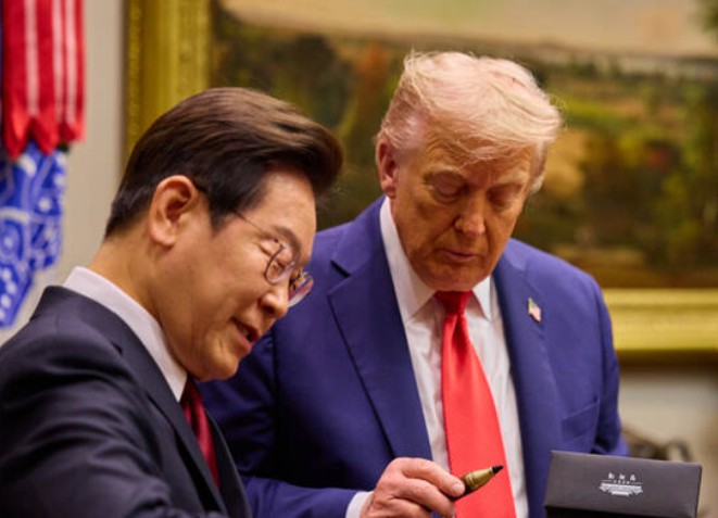 이재명 대통령이 8월 25일(현지시간) 미국 워싱턴DC 백악관에서 열린 한미 정상회담에서 도널드 트럼프 미국 대통령에게 방명록 작성 때 쓴 만년필을 선물하고 있다. 연합뉴스
