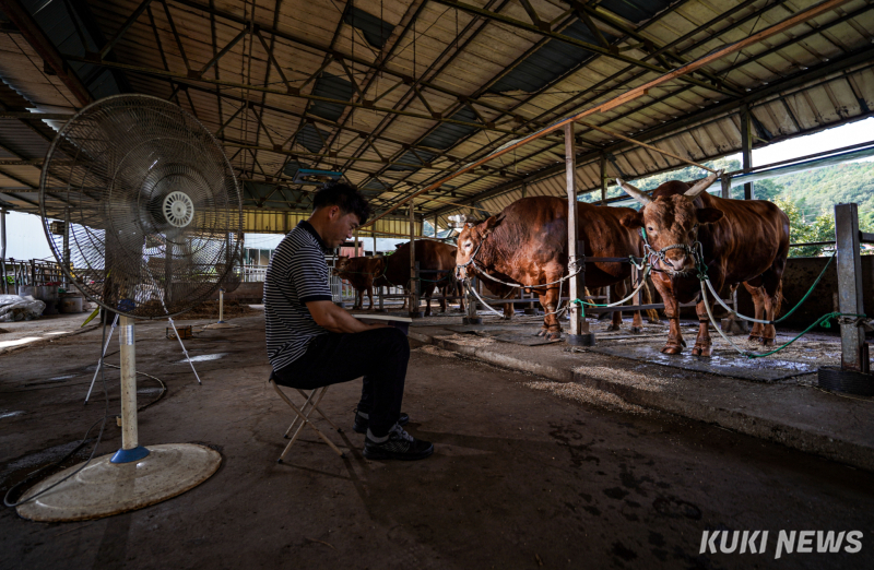 해가 기울면 소들이 먼저 일어난다. 물가 풀을 한 번 더 뜯고, 길 가장자리에 줄을 맞춰 트럭 쪽으로 걸어간다. 누군가 멈추면 함께 멈춘다. 사육장에 돌아오면 샤워가 먼저다. 흙이 남으면 밤새 뒤척인다. 털 사이 진흙을 벗겨내고, 발굽 틈 먼지를 물줄기로 턴다. 이어 톱밥을 깔고 고무 깔판을 손본다. 혹서기(7~8월)에는 강가에서 다시 잠자리를 편다.