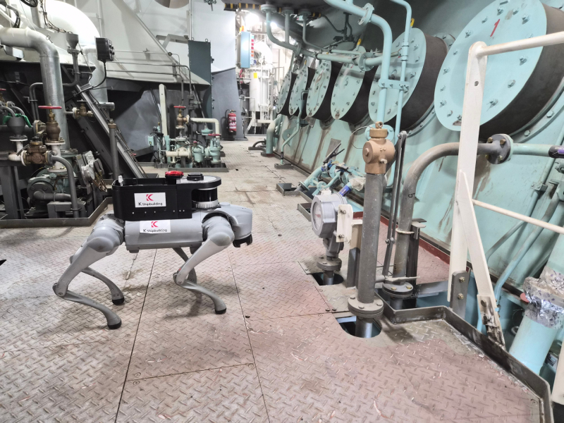 케이조선은 2일 팀그릿, 한국선급(KR)과 함께 건조 중인 선박의 갑판과 기관실 등 협소 공간에 4족 보행 로봇을 투입해 실증을 진행했다.