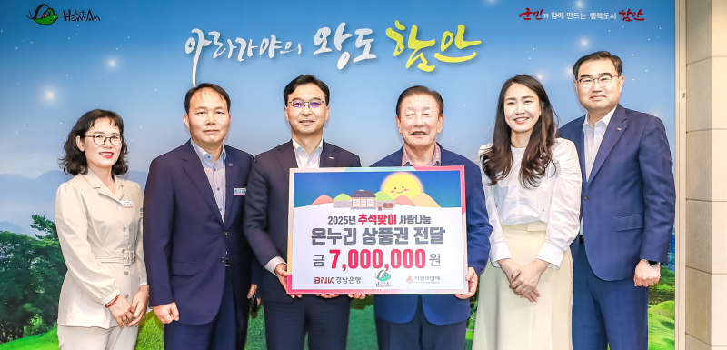 비엔케이(BNK) 경남은행 함안지점(지점장 윤권수)이 추석 명절을 앞두고 지역 내 소외계층을 지원하기 위해 700만원 상당의 온누리상품권을 기탁했다.