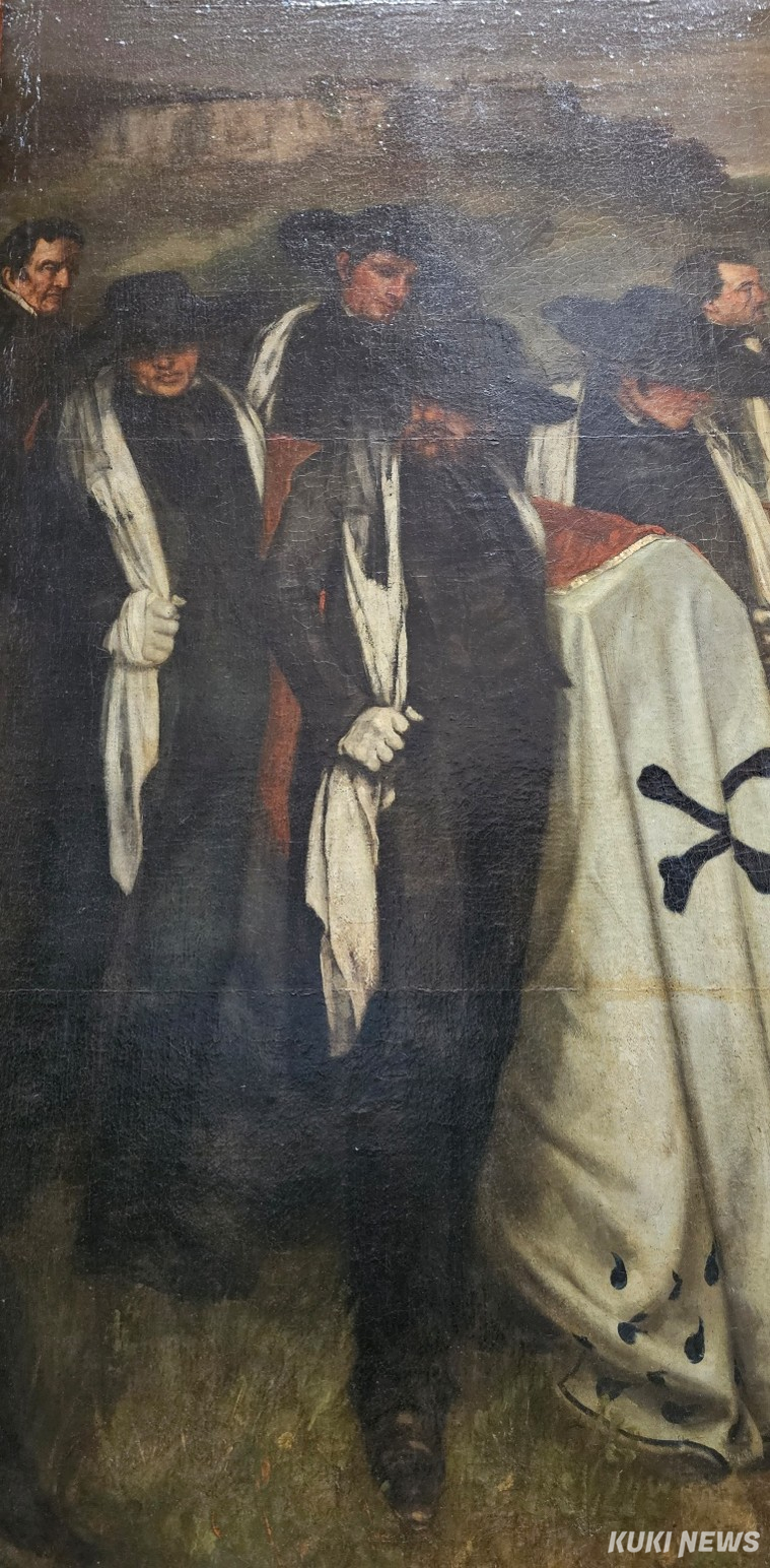화폭 왼쪽부터 자세히 살펴보자. 검은 옷을 입고 모자를 쓴 이들이 관을 운구하고 있다. 십자가가 새겨진 흰 천으로 관은 완전히 덥혀 있고, 배경에는 쿠르베의 고향인 오르낭의 백악 절벽이 보인다.