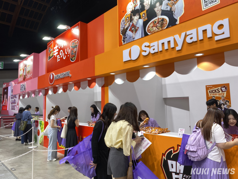메가 코스메랜드 행사장에 마련된 K-푸드 팝업 존. 심하연 기자 행사장 내부는 단순한 K-뷰티 전시를 넘어 K-팝·K-푸드·드라마까지 한데 어우러진 한류 체험 공간이 됐다. 현장에는 삼양·농심·CJ 미초 등 K-푸드 브랜드 부스도 함께 마련됐다. 평소 한국 라면을 즐긴다는 일본인 관람객 유시(31&가명)씨는 “처음 보는 제품을 직접 받아볼 수 있어 좋았다”며 “라면뿐 아니라 새로운 한국 음료 브랜드까지 소개돼 K-푸드 트렌드를 한눈에 확인했다”고 말했다. 그는 “K-팝과 드라마를 보며 한국 문화에 친숙해졌는데, 이렇게 한 자리에서 맛보고 체험하니 더 가깝게 느껴진다”고 덧붙였다.