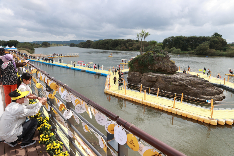 ‘부자 1번지 의령’ 문구를 형형색색의 꽃으로 장식해 축제장 곳곳에 풍성한 가을 분위기를 더했다. 관광객들은 솥바위 부교를 건너며 소원을 적은 종이를 매달아 ‘부자 기운’을 기원하는 등 기억에 남을 시간을 보내고 있다.