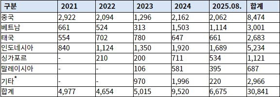 주1. 중국(2017년~), 베트남(2019년~), 태국(2020년~), 인도네시아(2021년~), 싱가포르(2022년~), 말레이시아(2023년~)