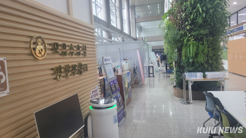 시의회 쪽에서 천안시청 종합민원실로 들어서면 좁은 미로가 나온다. 수유실·여행사 등 시설물 부스와 ‘풀잎 무성한’ 기둥이 민원인들 시야를 가린다. 사진=조한필 기자