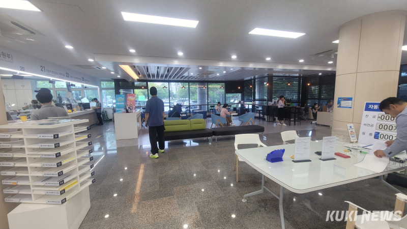 이같은 천안시 민원실에 민원인이 몰릴 때는 승객 만원의 시내버스를 연상케 한다. 중앙 기둥들에 장식한 풀잎 장식들은 민원실을 더욱 협소하게 만들었다. 민원서류 작성을 위한 사각형 탁자와 의자까지 배치해야 하니 민원실은 비좁지 않을 수 없다.