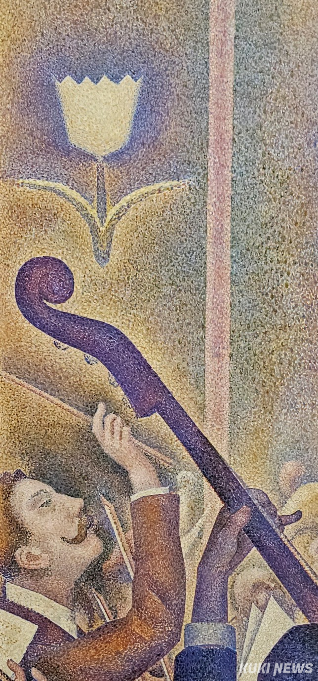 콘트라베이스 주자가 관람객에게 등을 돌리고 있는 장면은 에드가 드가의 <파리 오페라의 오케스트라>에서 비스듬히 등을 보이는 지휘자와 콘트라베이스 주자가 연상된다. 인상주의 드가와 후기 인상주의로 인상주의를 넘어서려 했던 쇠라의 시도가 성공적이었음을 한 눈에 알 수 있다.