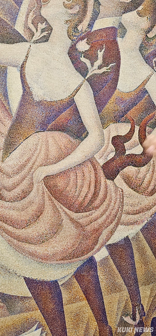 쇠라는 이 소란을 단순한 무대 장면으로 그리지 않았다. 그는 과학적 색채 이론과 조형 질서를 바탕으로, 빛과 색의 교향곡을 캔버스 위에 펼쳐냈다. 무용수들의 반복되는 곡선은 음악의 리듬을 시각화하고, 점 하나하나가 빛의 파동처럼 퍼져 나간다. 이 작품은 즉흥적인 스냅샷이 아니라, 철저한 계산과 인내의 산물이다.