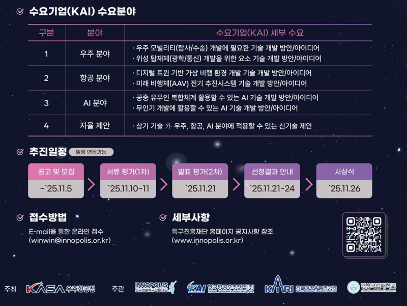 한국항공우주연구원(이하 항우연)과 한국항공우주산업㈜(KAI), 경상국립대가 주관하는 이번 행사는 기업 수요 기술 아이디어를 공모해 수상자들에게 기술실증 지원, 공동개발, 투자 등을 지원하는 프로그램이다.