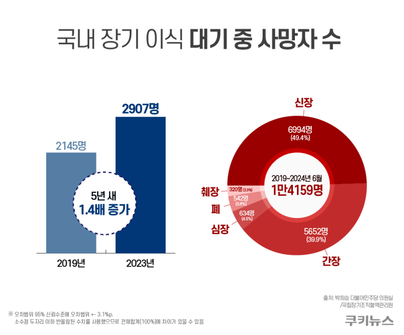 고령화와 의료 기술의 발달로 장기 이식을 기다리는 대기자가 매년 늘고 있지만, 대부분의 이식 대기자는 오랜 기간 동안 기증자를 기다리다 세상을 떠난다. 장기조직혈액관리원(KONOS)에 따르면, 매년 장기 이식 대기 중 사망자는 2000명을 웃돈다. 2022년과 2023년에 사망한 환자는 각각 2918명, 2907명으로 3000명에 육박했다. 하루 평균 8명꼴이다. 2019년에서 2024년 6월까지 이식 대기 중 사망자는 1만4159명에 달한다.