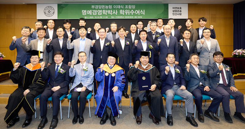 인제대가 16일 김해캠퍼스 본관 대강당에서 지역 양돈산업의 혁신과 ESG 경영을 이끌어온 이재식 부경양돈농협 조합장에게 명예경영학박사 학위를 수여했다. 이재식 조합장은 지역 산업 발전과 상생에 기여한 공로를 인정받아 명예박사 학위를 받았다.
