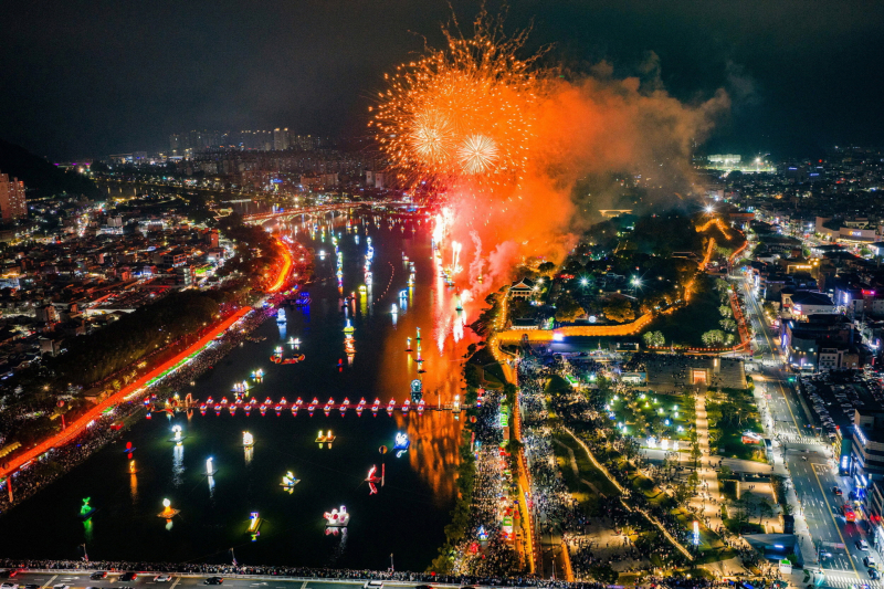 축제의 하이라이트인 수상 불꽃놀이와 드론 라이트쇼는 매 공연마다 관람객들의 시선을 사로잡으며 폭발적인 반응을 이끌어냈다. 특히 올해 처음 선보인 불꽃 드론은 기존 드론 쇼에 입체감과 화려함을 더해 완성도를 높였으며, 하늘을 수놓은 불꽃과 함께 압도적인 장면을 연출해 관람객들에게 잊지 못할 감동을 선사했다.