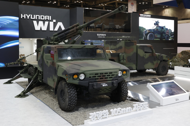 가장 눈에 띈 전시물은 경량화 105㎜ 자주포다. 기존 대비 중량을 절반 이상 줄여 소형전술차량에 탑재할 수 있도록 설계된 이 자주포는 최대사거리 18km를 확보했다. 현대위아는 전시에서 사격지휘차량과 탄약운반차량과 연계해 운용하는 시나리오를 함께 소개하며, 경량화로 헬기 공중수송이 가능한 점도 강조했다.