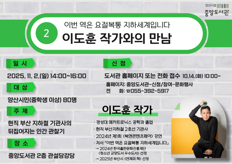 이도훈 작가와의 만남은 중학생 이상의 양산시민이면 누구나 참여할 수 있으며, 행사 참여자 중 추첨을 통해 5명에게 작가의 저서를 증정한다. 참가 신청은 현재 도서관 누리집 혹은 전화 접수로 가능하며, 선착순 80명까지 모집한다.