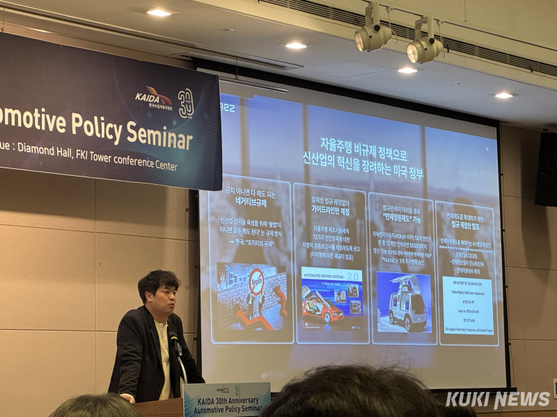 21일 열린 ‘한국수입자동차협회(KAIDA) 창립 30주년 자동차 정책 세미나’에서 유민상 오토노머스에이투지(A2Z) 상무는 “정부가 규제보다 속도를 택해야 한다”며 이같이 말했다. 이날 세미나에서는 정부, 학계, 업계 인사들이 참석해 자율주행차와 첨단안전장치 제도 개선 방향 등에 대해 논의했다.