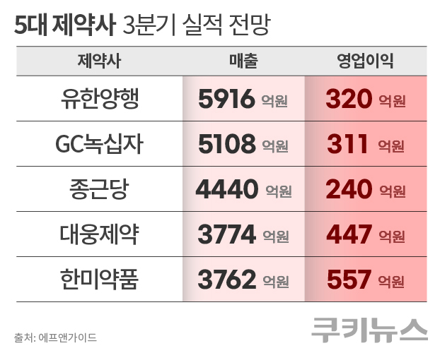 22일 에프앤가이드의 3분기 시장 평균 전망치(실적 컨센서스)에 따르면 한미약품, 대웅제약, 유한양행, GC녹십자, 종근당 등 국내 주요 제약사의 매출은 대체로 증가하는 반면, 일부는 영업이익률이 전년 대비 감소할 것으로 예상됐다.